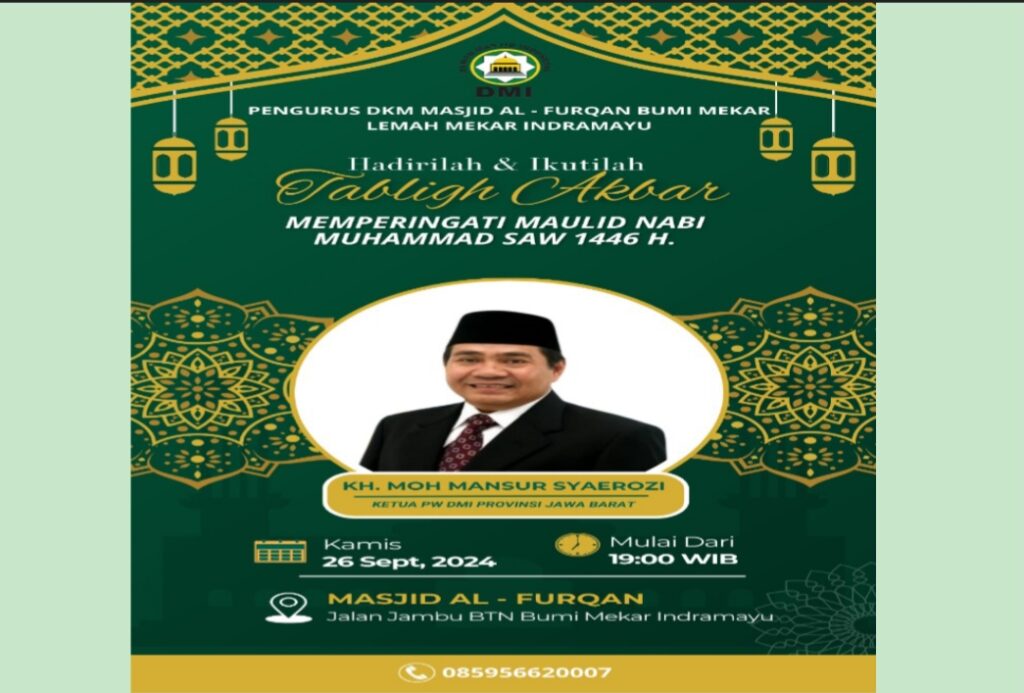 Kagetnews | Indramayu – Pengurus Dewan Kemakmuran Masjid (DKM) Al Furqon di Bumek Lemahmekar Indramayu, akan menyelenggarakan acara tabligh akbar untuk memperingati Maulid Nabi Muhammad SAW pada tanggal 26 September 2024. Acara ini bertujuan untuk memperkuat iman dan meningkatkan kecintaan umat Islam terhadap Rasulullah. KH. Moh Mansur Syaerozi Ketua PW DMI Jabar sekaligus seorang ulama […]