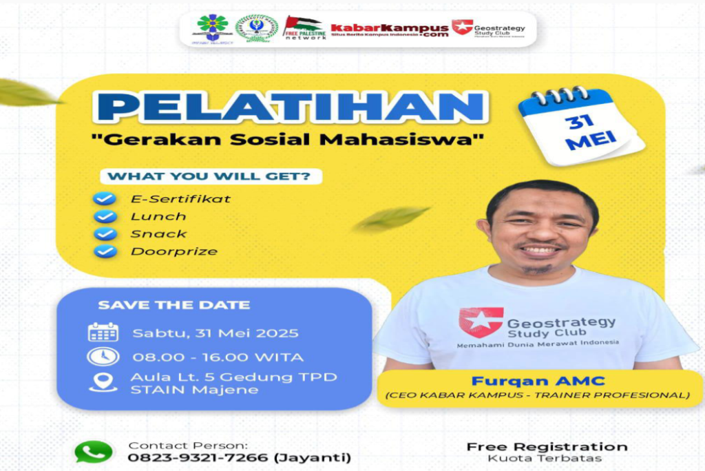 Kagetnews | Jakarta – Free Palestine Network (FPN) Pokja Majene & Polman bekerjasama dengan DEMA STAIN Majene, mengadakan “Pelatihan Gerakan Sosial Mahasiswa” dengan menghadirkan CEO Kabar Kampus, Furqan AMC. Selain sebagai Sekjen Free Palestine Network (FPN), aktivis 98 ini juga dikenal sebagai Sekjen Geostrategy Study Club (GSC). Pelatihan ini sedianya akan diselenggarkan pada hari Sabtu, […]