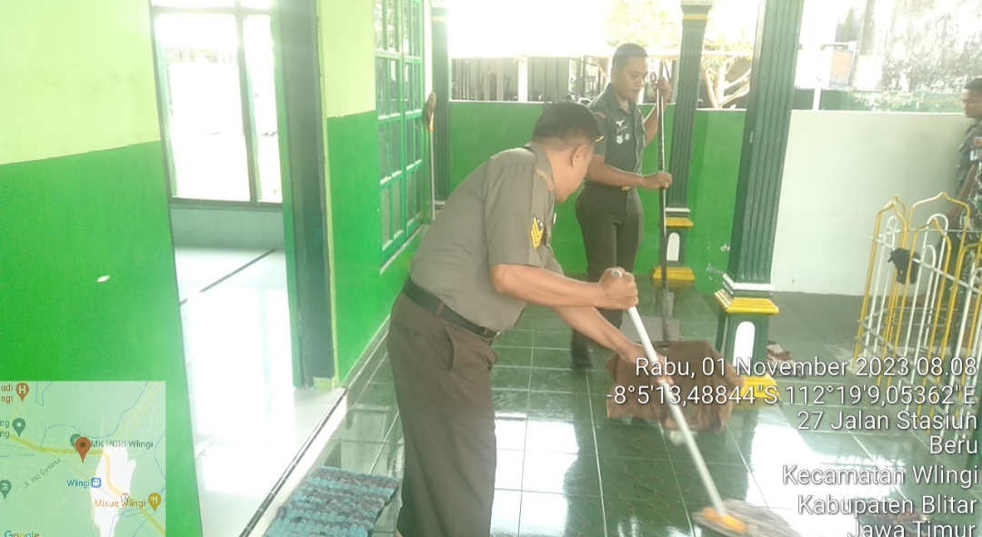 Kagetnews | Blitar – Anggota Koramil 0808/12 Wlingi Kodim 0808/Blitar Serda Mamat Setiawan bersama personel yang lain dari anggota BPBD Kabupaten Blitar dan warga masyarakat, melaksanakan kegiatan pembersihan tempat ibadah, bertempat di Mushola Ar Rohmah yang terletak di Lingkungan Beru Kel. Beru Kec. Wlingi Kabupaten Blitar, Rabu (1/11/2023).