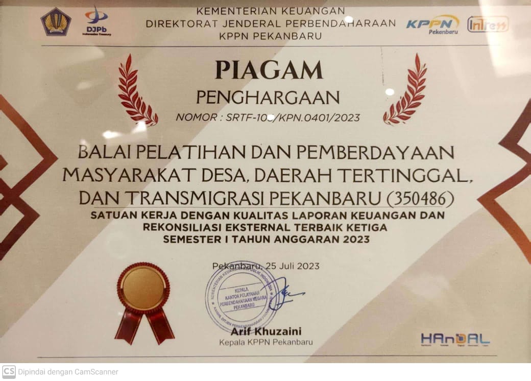 BPPMDDTT Pekanbaru mendapatkan penghargaan terbaik ke 3 kategori satuan kerja dengan kualitas laporan dan rekonsiliasi eksternal semester 1 tahun 2023. Kami (BPPMDDTT Pekanbaru .red) adalah bagian dari lembaga pemerintahan penyelenggara negara yang dituntut untuk memahami penggunaan anggaran itu harus terinci. Penggunaan aset negara dan perawatannya harus dapat dipertanggungjawabkan dengan akuntabel. “Bahkan satu rupiah uang negara harus dipertanggungjawabkan dan menghasilkan pembangunan bagi negara,” jelas Mhd. Taufik (Kasubag TU BPPMDDTT Pekanbaru) disaat menerima penghargaan mewakili Kepala Balai.