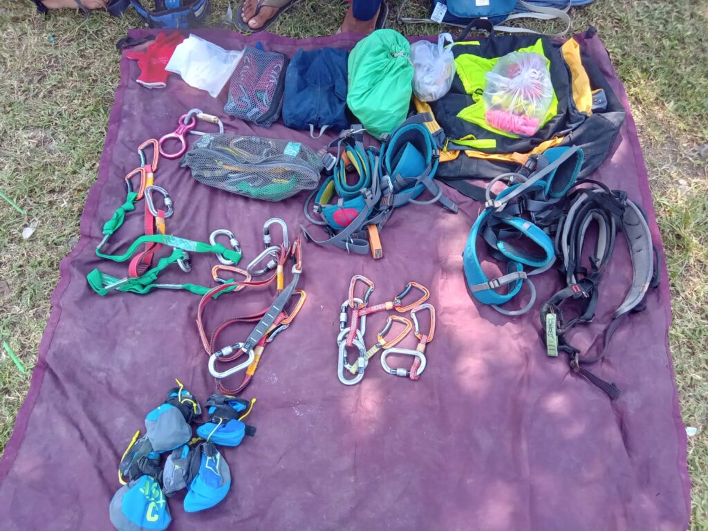 Perlengkapan Panjat Tebing. (foto:Ist)Panjat tebing ini membutuhkan banyak peralatan yg harus dipakai seperti Harnes, Sepatu Panjat, Carmantel, Calkbag, Carabiner, Figur Eight, Auto Stop/Gri-Gri dan masih banyak lainnya.