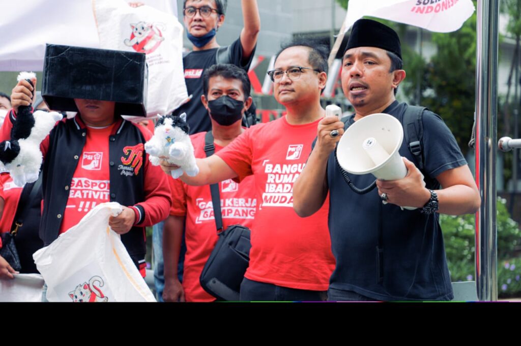 Kemudian Furqan mengomando kader-kader PSI untuk mengeluarkan boneka kucing yang ada dalam karung dan mempertontonkannya pada wartawan.