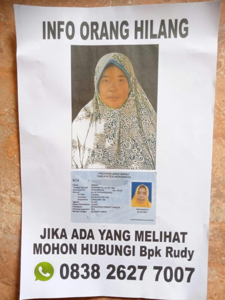 Kagetnews | Indramayu – Telah hilang seorang perempuan diperkirakan usia 63 tahun, ia bernama Aminih saudara kembar dari Aminah Alamat Blok Kedungwaru RT/012 RW/006 Desa Drunten Wetan Kecamatan Gabus Wetan Kabupaten Indramayu.Sampai saat ini belum diketemukan.