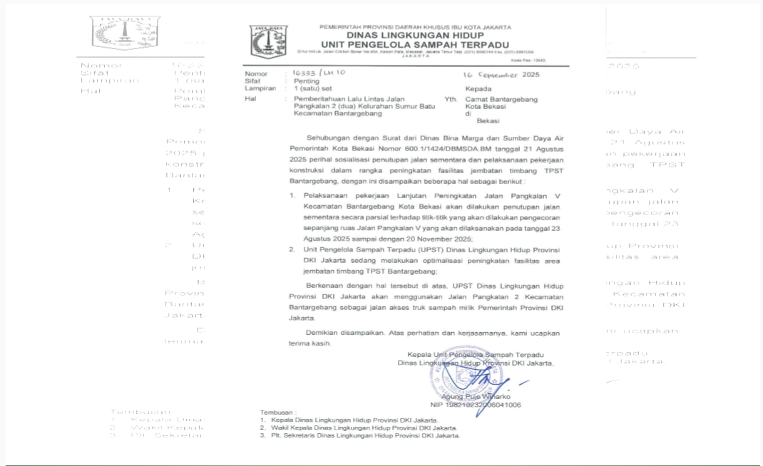 Kagetnews | Bekasi – Polemik jalur keluar truk sampah milik Pemprov DKI Jakarta di TPST Bantargebang memasuki babak baru. Setelah ramai diberitakan di berbagai media tentang truk-truk DKI yang melintas keluar melalui Jalan Raya Pangkalan 2, tiba-tiba saja belum enam jam sudah muncul sebuah surat resmi dari Unit Pengelola Sampah Terpadu (UPST) Dinas Lingkungan Hidup (DLH) DKI Jakarta yang ditujukan kepada Camat Bantargebang.