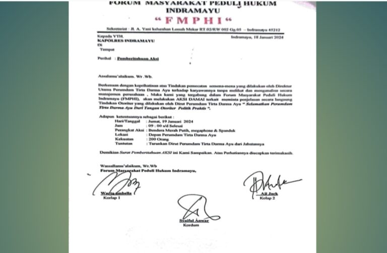 Kagetnews | Indramayu – Orang-orang yang tergabung dalam Forum Masyarakat Peduli Hukum Indramayu (FMPHI) pada hari ini Jumat 19 Januari 2024 akan lakukan aksi damai di depan Kantor Perumdam Tirta Darma Ayu (TDA).