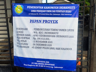 Kagetnews | Indramayu – Pemerintah Kabupaten Indramayu melaksanakan proyek pembangunan tempat parkir di kantor Dinas Pekerjaan Umum dan Penataan Ruang (DPUPR) yang berlokasi di Jalan Pahlawan. Proyek tersebut dipercayakan kepada CV Dua Aksara Nusantara dengan nilai kontrak sebesar Rp 386.612.000, sesuai dengan spesifikasi teknis yang telah ditetapkan.