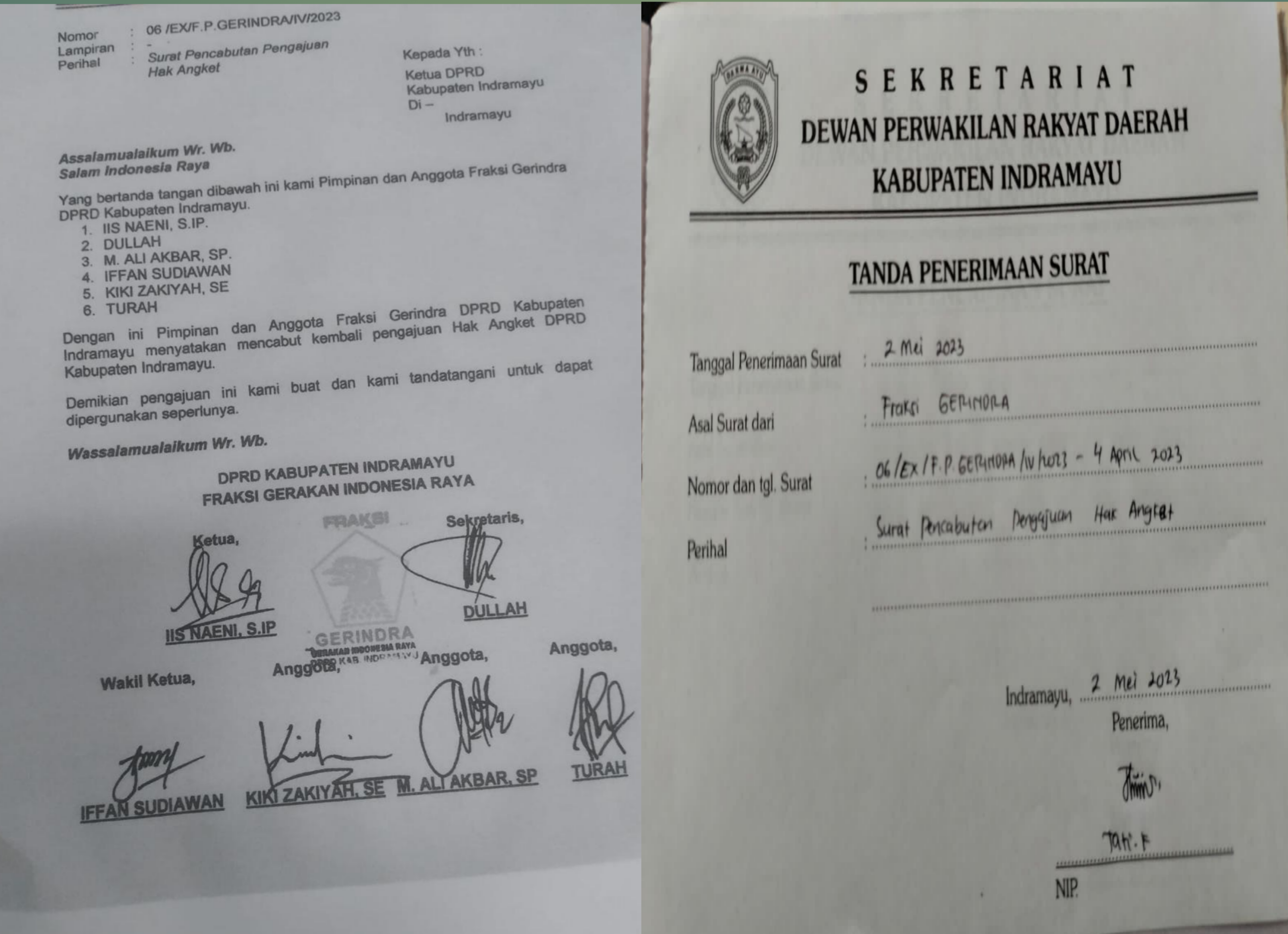 Dokumen pencabutan hak angket dari anggota Partai Gerindra Indramayu, 2/5/2023. (Istimewa)