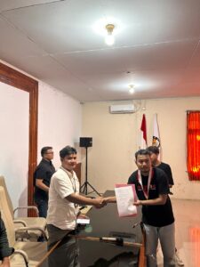 Potret Ketua GMNI DPC Indramayu bersama Ketua KPUD Indramayu Maskur berjabat tangan usai menandatangani nota kesepakatan, 17/05/2024. (Istimewa)