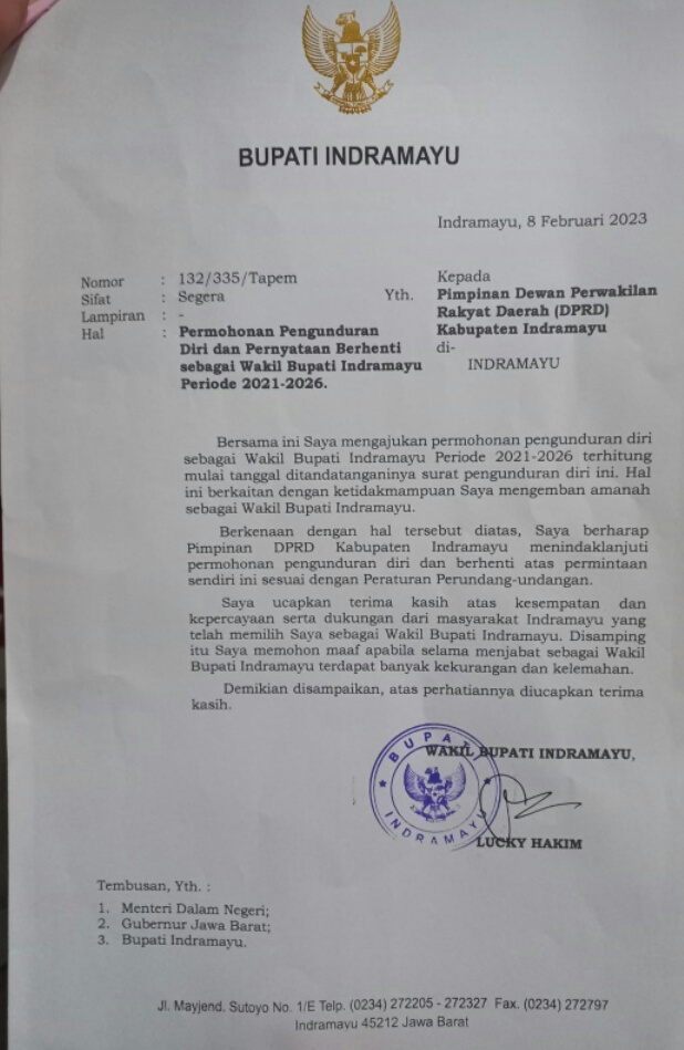 Jagat media sosial dan grup-grup WhatsApp (WA) digegerkan dengan beredarnya surat pengunduran diri Lucky Hakim dari jabatannya sebagai Wakil Bupati (Wabup) Indramayu. Pada sisi lain surat pengunduran diri Lucky Hakim ditembuskan kepada Menteri Dalam Negeri, Gubernur Jawa Barat dan Bupati Indramayu.