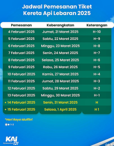 “KAI berkomitmen untuk menghadirkan pengalaman perjalanan yang aman, nyaman, dan berkesan bagi seluruh pelanggan pada masa Angkutan Lebaran 2025. Dengan layanan yang semakin baik dan berbagai inovasi yang diterapkan, KAI berharap dapat memberikan pengalaman mudik yang lebih menyenangkan bagi seluruh masyarakat pada momen Lebaran nanti,” tutup Rokhmad. *** (Rls)