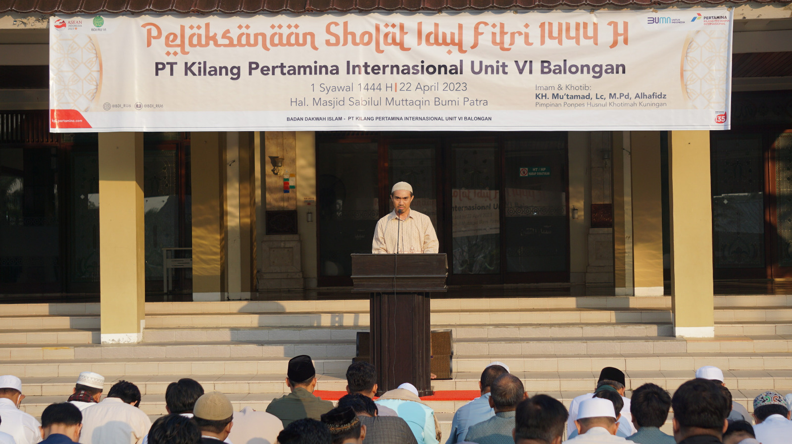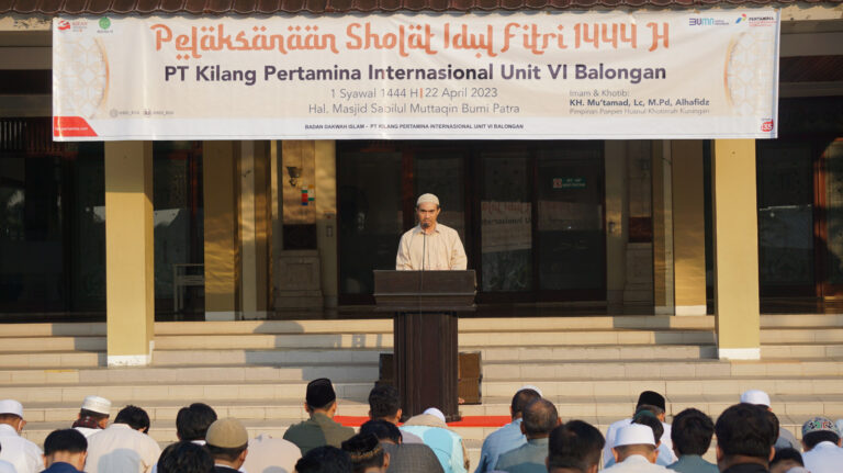 Kagetnews | Indramayu – Sholat Ied di Lingkungan PT Kilang Pertamina Internasional (KPI) Refinery Unit VI Balongan berlangsung khidmat. Pada Hari Raya Idul Fitri 1444 Hijriah ini, Sholat Ied digelar di Halaman Masjid Sabilul Muttaqien, Perumahan Pertamina Bumi Patra Indramayu, Sabtu (22/4/2023).