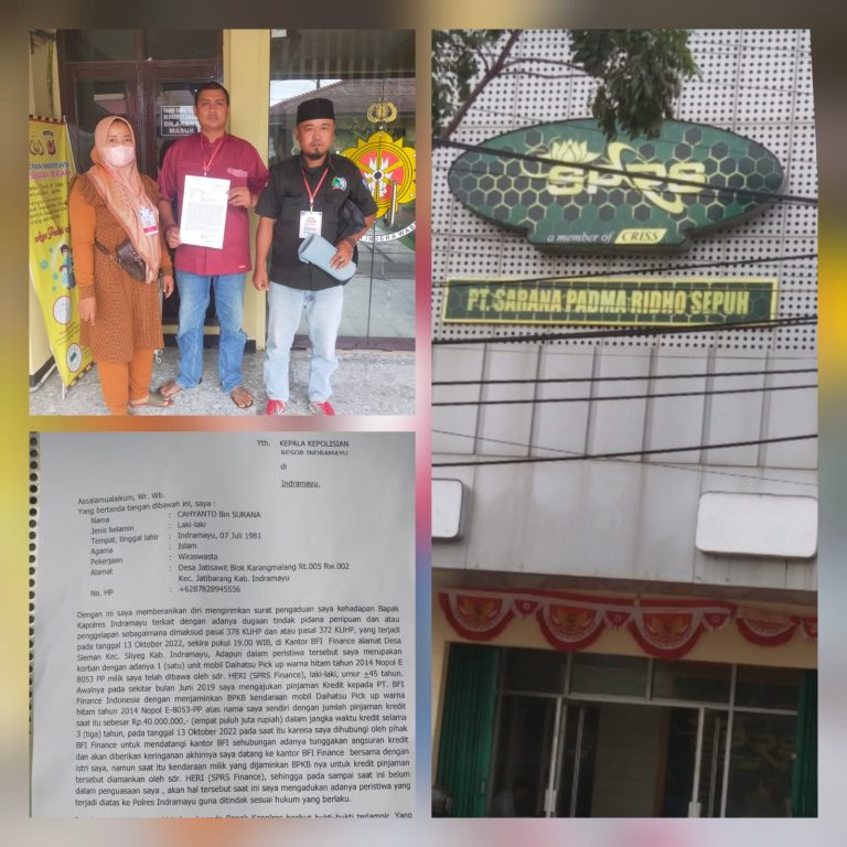Dalam rangka mencari keadilan dan tegaknya hukum atas dugaan tindak pidana penipuan dan penggelapan satu unit kendaraan roda empat jenis pickup terjadi pada Oktober kemarin yang dilakukan oleh oknum debt collector dari PT. SPRS yang terjadi di halaman kantor PT. BFI finance Desa Sleman, Kecamatan Sliyeg Indramayu.