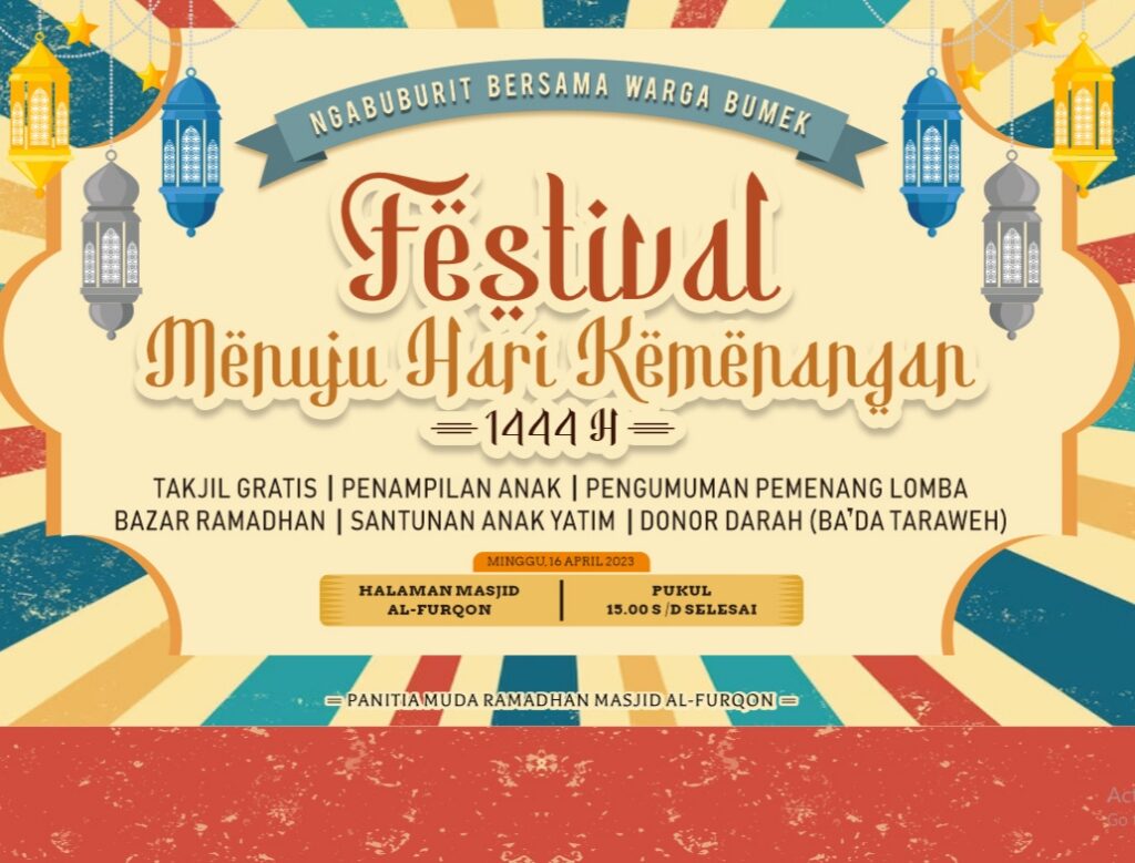 Kagetnews | Indramayu – Masjid Al Furqon Perumahan Bumi Mekar Permai (Bumek) selenggarakan Festival Menuju Hari Kemenangan, kegiatan ini sengaja diselenggarakan untuk menyambut kedatangan 1 Syawal/Hari Raya Idul Fitri 1444 Hijriah, Minggu 16 April 2023.