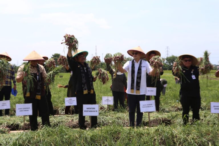 Kagetnews | Brebes – Menteri Pertanian Syahrul Yasin Limpo (Mentan SYL) bersama Wakil Menteri Perdagangan Jerry Sambuaga bersama Wakil Gubernur Jawa Tengah KH. Taj Yasin Maimoen melakukan panen raya sekaligus pelepasan bawang merah di Kabupaten Brebes sebanyak 25 truk atau 175 ton ke Pasar Induk Kramat Jati, Jakarta. Panen dan pelepasan bawang merah dari jantung produksi bawang merah nasional ini guna memastikan produksi dan ketersediaan bawang merah menjelang Ramadhan hingga Lebaran aman sekaligus upaya menstabilkan harga.