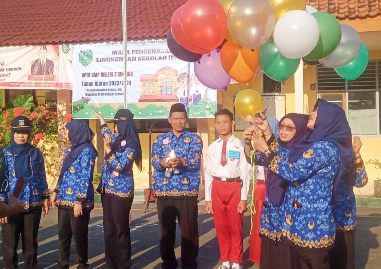 Kagetnews | Indramayu – Pelaksanaan Masa Pengenalan Lingkungan Sekolah (MPLS) SMPN 3 Sindang lndramayu dibuka dengan ditandai penglepasan sepasang merpati putih dan untaian balon udara yang dilaksanakan setelah pelaksanaan upacara rutin Hari Senin pagi. 17/7/2023.
