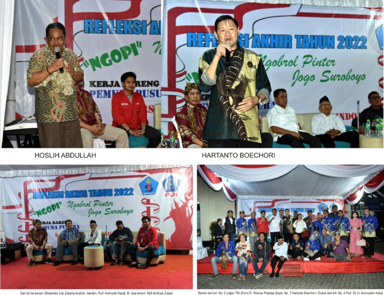 Kagetnews | Surabaya – Sebagai bentuk refleksi akhir tahun 2022, PJI (Persatuan Jurnalis Indonesia) dan Pemuda Pusura kerja bareng mewujudkan acara “Ngopi” (Ngobrol Pinter) dengan tema “Jogo Suroboyo” di halaman PUSURA Jl. Yos Sudarso No 9 Surabaya, Jum’at 30/12/2022. Acara dimoderatori Zakaria Anshori, SH, MH, MKn./Cak Zakaria.