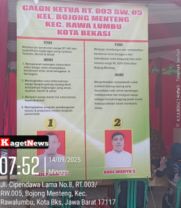 Kagetnews | Bekasi – Suasana pemilihan Ketua RT 03 di wilayah Bojong Menteng Kecamatan Rawalumbu Kota Bekasi terlihat ramai, lancar dan tertib pada hari Minggu 14 September 2025. Acara yang dimulai pukul 08.00 WIB dan ditutup pada pukul 14 00 WIB. dihadiri oleh warga setempat dengan antusiasme yang tinggi.