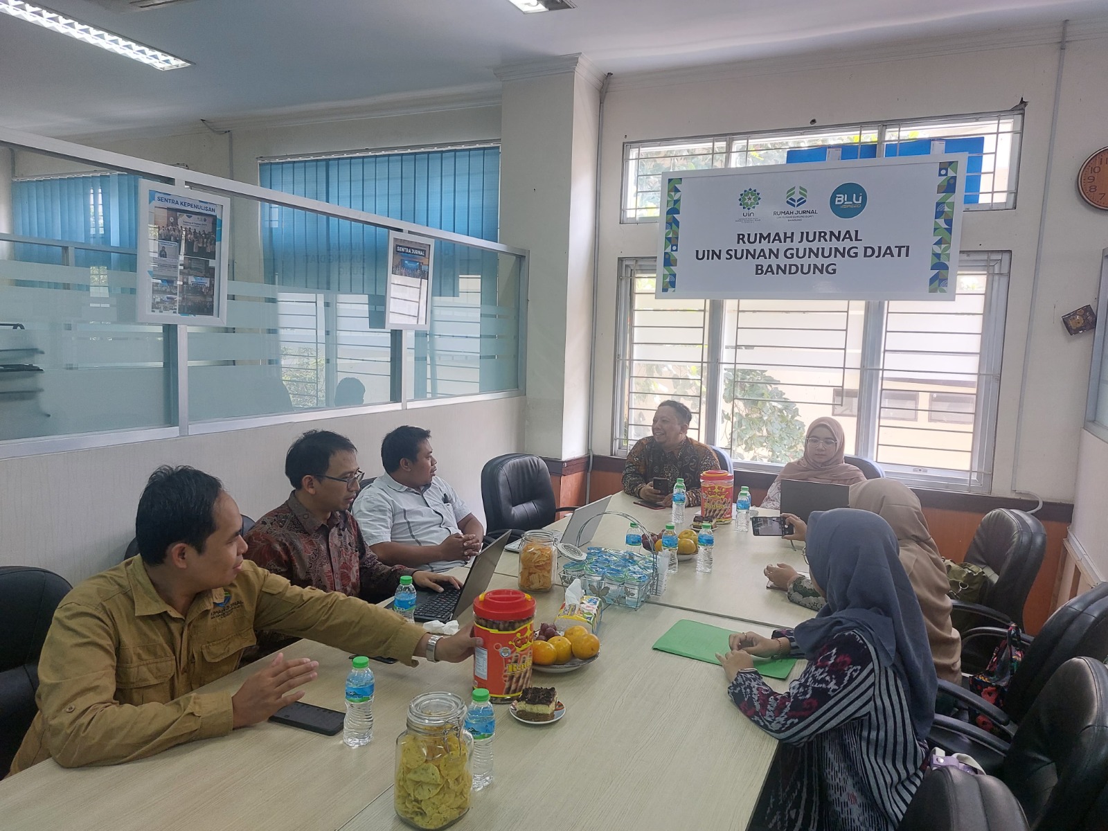 Tim PLKKMO, yang terdiri dari Mulyawan Safwandy Nugraha sebagai Editor in Chief Jurnal Lektur Keagamaan, Nur Rahmah, Istiana Wulandari, Maudy Missfhanny, dan Sustina, disambut oleh Ketua Rumah Jurnal UIN Bandung, Hamdan Sugilar, bersama Ferli Septi Irwansyah sebagai Ketua Sentra Publikasi Rumah Jurnal, serta Busro, yang berperan sebagai editor dan reviewer dari berbagai jurnal di UIN Bandung.