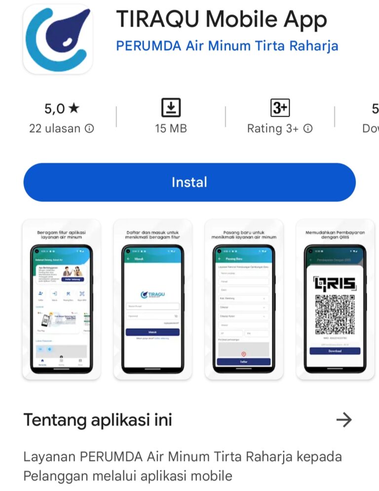 Untuk mengunduh aplikasi TiraQu, pelanggan dapat mengunjungi toko aplikasi resmi Google Play Store untuk pengguna OS Android. Untuk kedepannya, aplikasi TiraQu juga akan hadir di App Store untuk pelanggan yang menggunakan iOS. Aplikasi ini tersedia secara gratis dan dapat diakses oleh seluruh masyarakat yang telah menjadi pelanggan atau calon pelanggan Perumda Air Minum Tirta Raharja. *** (Muhamad)