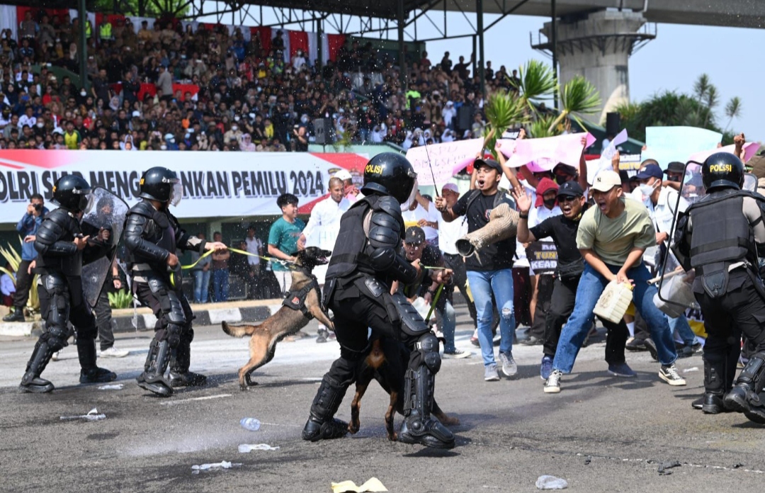 Dalam kesempatan itu, diperlihatkan juga simulasi dalam menanggulangi aksi massa saat proses penghitungan suara di titik-titik rawan seperti kantor KPU, dan kawasan pusat pemerintahan serta bisnis dengan mengedepankan urutan penanganan mulai dari mediasi, pengamanan defensif, sampai pada penguraian massa dengan meriam air dan gas air mata.