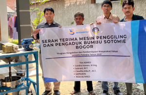 Potret serah terima mesin penggiling dan pengaduk bumbu otomatis dari Tim Admisisi Polindra kepada pelaku UMKM Soto Mie Bogor. (Ist)