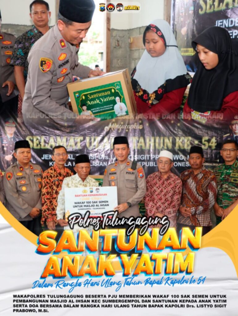 Kagetnews | Tulungagung – Masih dalam suasana di hari raya idul fitri 1444 H, Polres Tulungagung Polda Jatim mengadakan kegiatan santunan kepada 50 anak yatim piatu dan bagikan 100 sak semen di lingkungan masjid Al Iksan Desa Sambrirobyong kecamatan Sumbergempol kabupaten Tulungagung . Seperti halnya yang dilaksanakan Kapolres Tulungagung AKBP Eko Hartanto, SIK, MH. Yang […]
