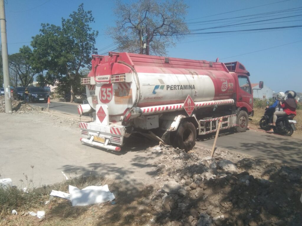 Mobil Pengangkut Bahan Bakar Terperosok di jalan Tambak Indramayu