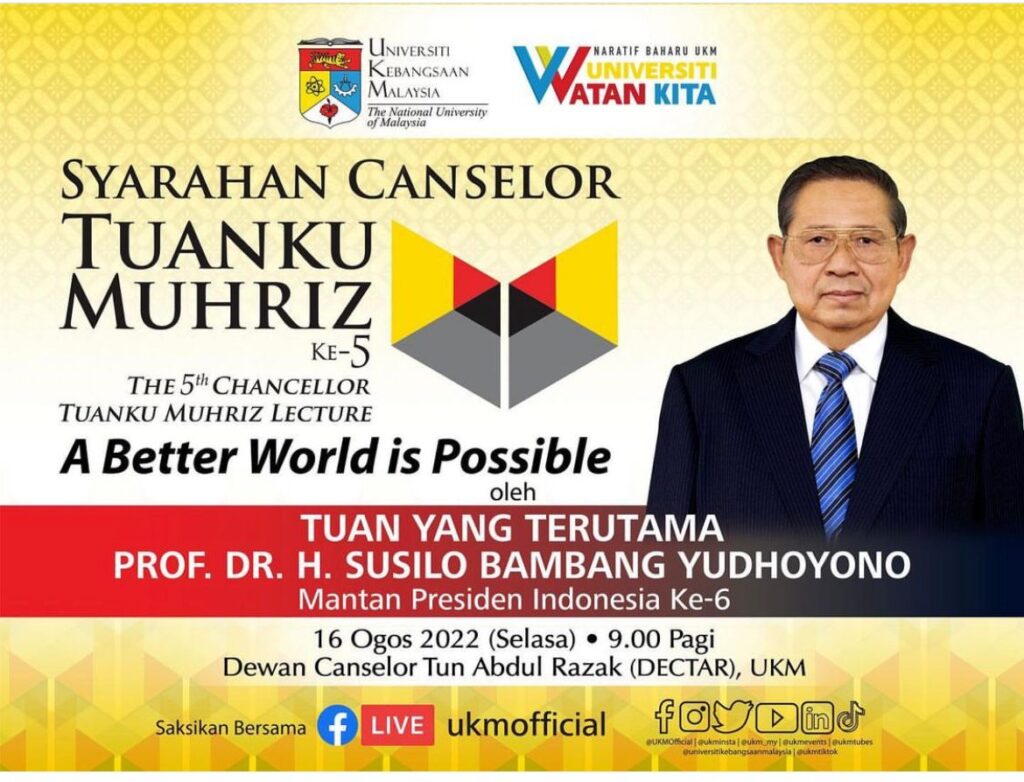 Kagetnews | Jakarta – Presiden RI ke-6, Susilo Bambang Yudhoyono (SBY), menjadi keynote speaker dalam acara Syarahan Canselor Tuanku Muhriz Ke-5 di Universiti Kebangsaan Malaysia (UKM), Selasa (16/8/2022). SBY menyampaikan kuliah umum yang berjudul “A Better World is Possible”. Dalam pidatonya, SBY menyoroti tiga isu kritis yang menghadirkan tantangan bagi masyarakat internasional hari ini, yaitu: […]