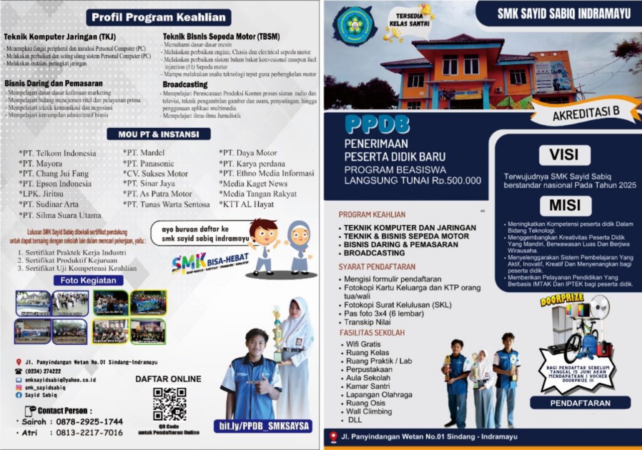 Jangan lewatkan kesempatan ini untuk bergabung dengan komunitas SMK Sayid Sabiq Indramayu yang dinamis dan berprestasi! Daftarkan dirimu sekarang untuk memulai perjalanan pendidikan yang menginspirasi!